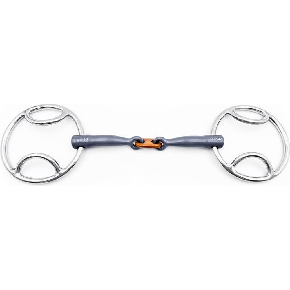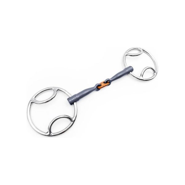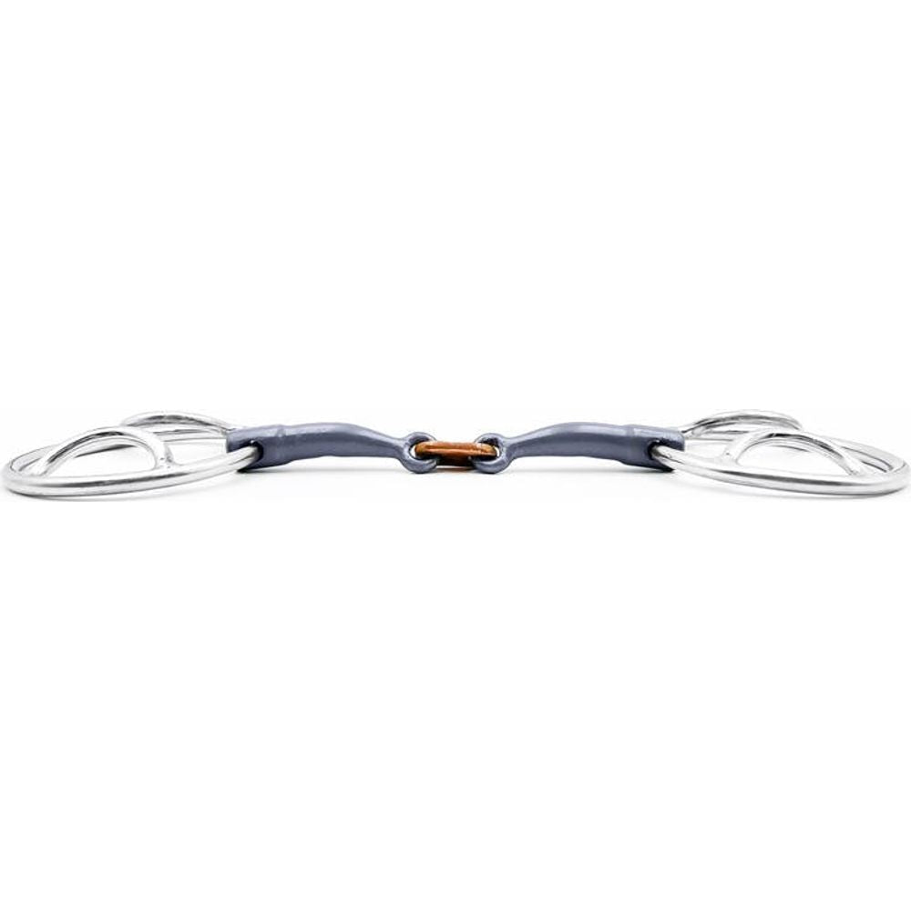 A Beval bit has a similar effect to a 2 ½ & 3 ring snaffle, but has a softer effect and less leverage. Gives a flexible, soft feeling in the hand. This bit can be used with the reins in multiple positions depending on what effect you’d like from the bit. It can also be used with a gag rein thanks to the special design with bent loop rings on the inside. The gag rein can slide smoothly in the loop rings.