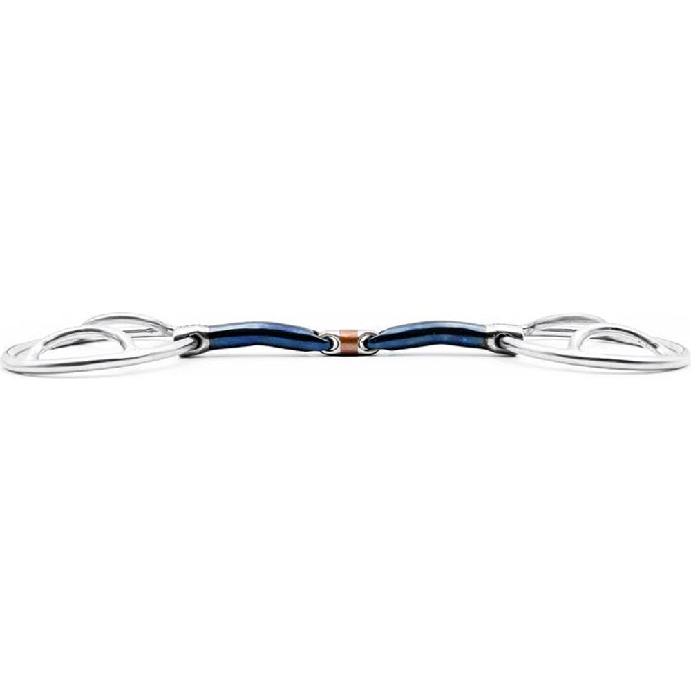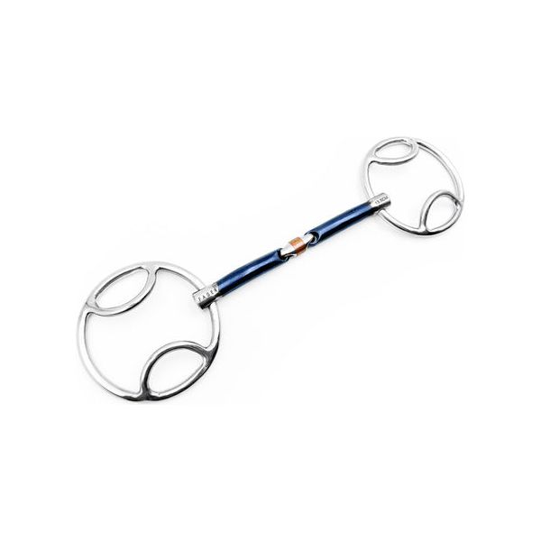 A Beval bit has a similar effect to a 2 ½ & 3 Ring Snaffle, but has a softer effect and less leverage. Gives a flexible, soft feeling in the hand.This bit can be used with the reins in multiple positions depending on what effect you’d like from the bit.