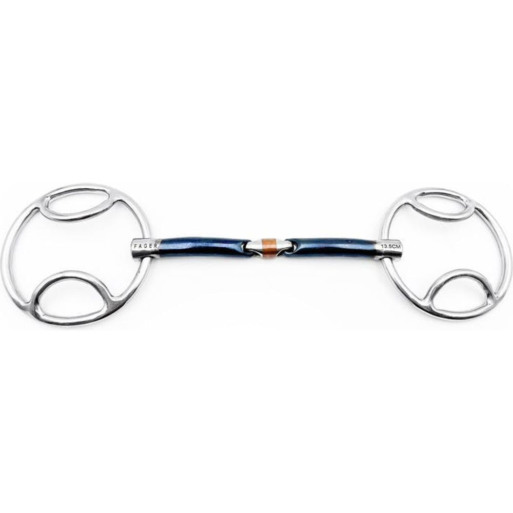 Fager John is a Double-Jointed Beval bit. Our bits are designed to have a 100% smooth surface, including around the joints. The joints are designed and constructed to ensure they never push against the palate or sit on top of the bars. All these clever features result in an extremely comfortable bit which naturally fits the contours of the tongue.