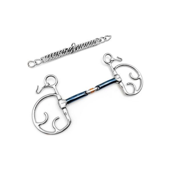 The Kimblehook can be described as a fixed ring with the possibility to add leverage when you need it. The further down you place your rein; the more pressure will be added and divided between chin, poll, and mouth.