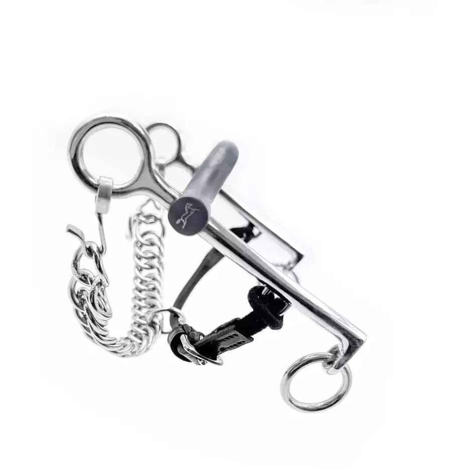 The lip strap runs between the shanks and passes through the center ring on the curb chain. The lip strap is easy to attach to the shanks.