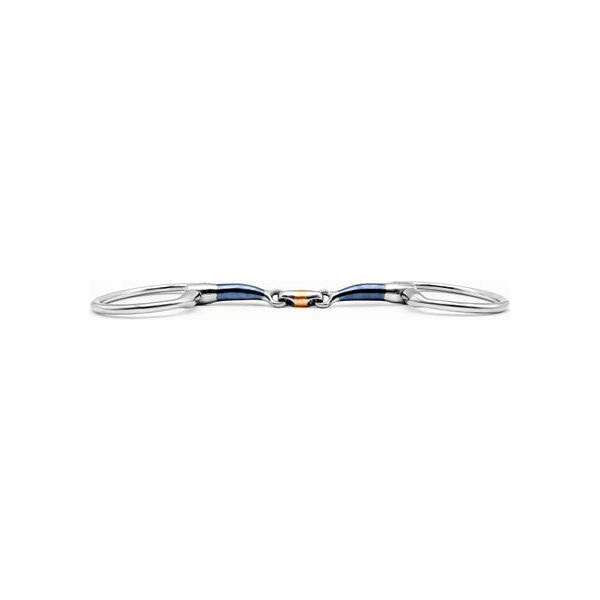 With the horse logo upside down on the left side running forward, the joints will follow the tongue to make the pressure in the tongue more gentle. This can be good for sensitive horses who need clear but gentle signals.