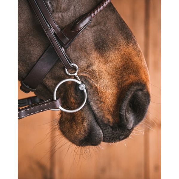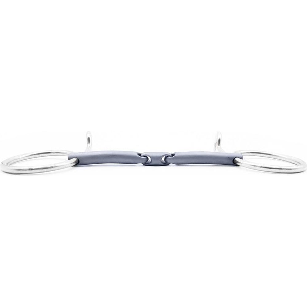 A very comfortable bit that shapes naturally around the tongue and reveals the bars from constant pressure by having the upper ring carrying the bit itself and the loose ring on the outside. The joints will never interfere or push against the palate.