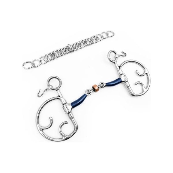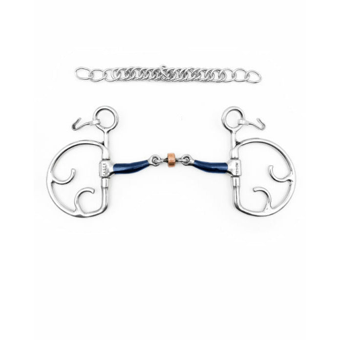 The Kimblehook can be described as a fixed ring with the possibility to add leverage when you need it. The further down you place your rein; the more pressure will be added and divided between chin, poll, and mouth.