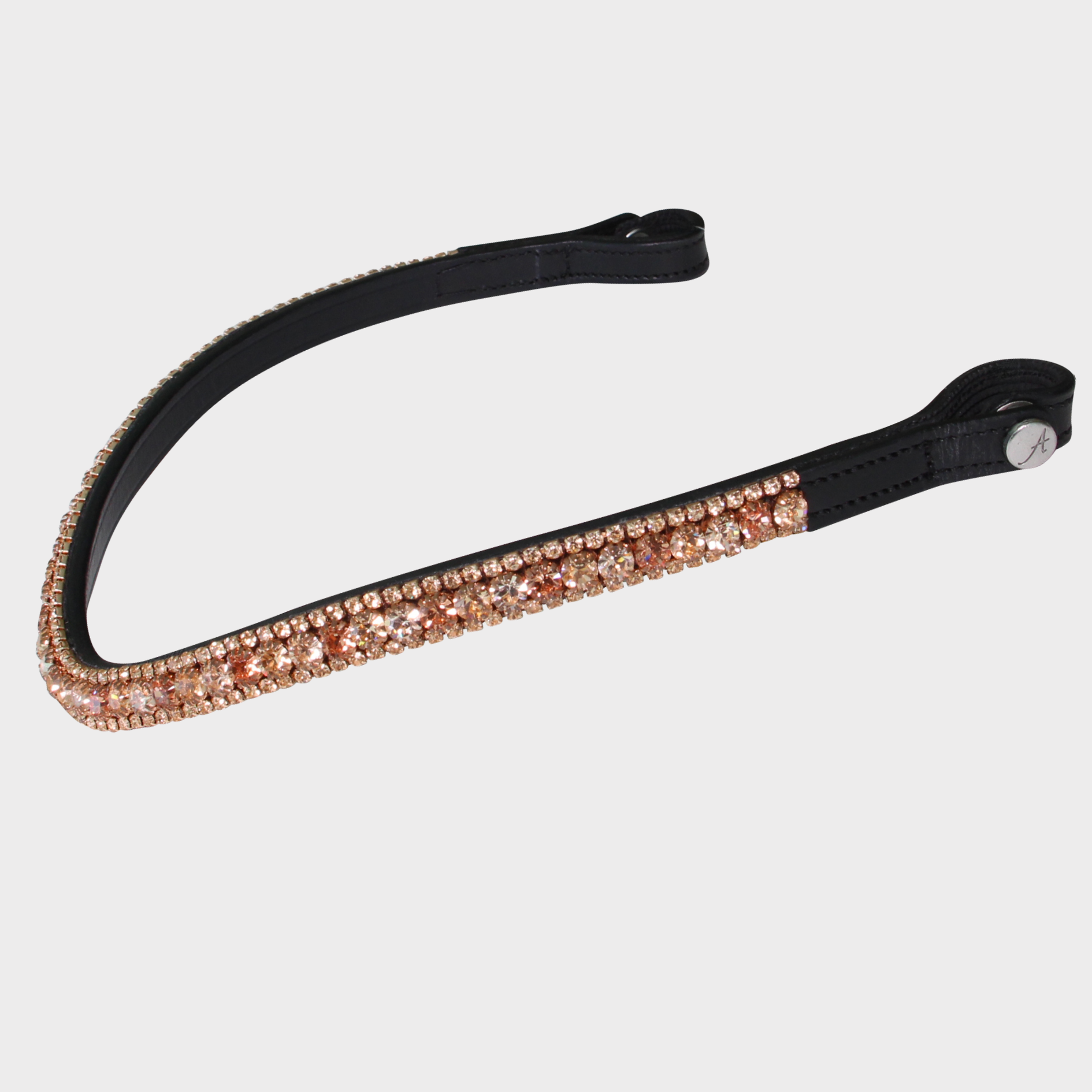 Hand‑crafted from Italian leather, the Lux Rosegold Browband delivers instant ring‑side impact with three rows of precision‑set Swarovski® crystals. Includes a protective sleeve and spare outer crystals.