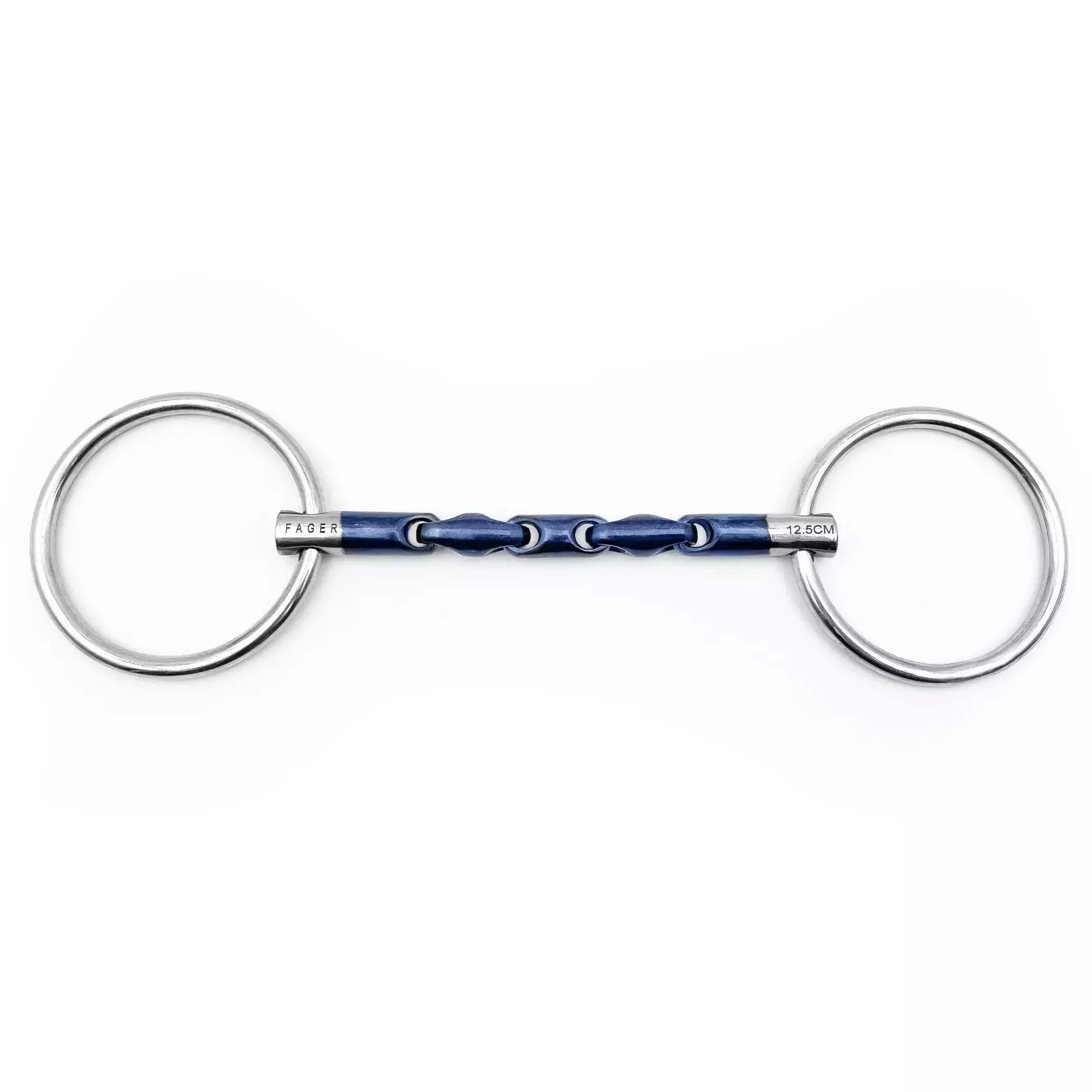 Fager’s designs are always designed to sit horizontally straight, never allowing a bigger forward bend. We design them this way to maintain the balance point (BP) in the mouth. A bigger bend forward moves the BP forward, slowing down the effectiveness of the aids. This design creates stability for the horse enabling clear communication. The unique design also protects the bars and mouth against cuts, sores, and rubs, even on sensitive horses.